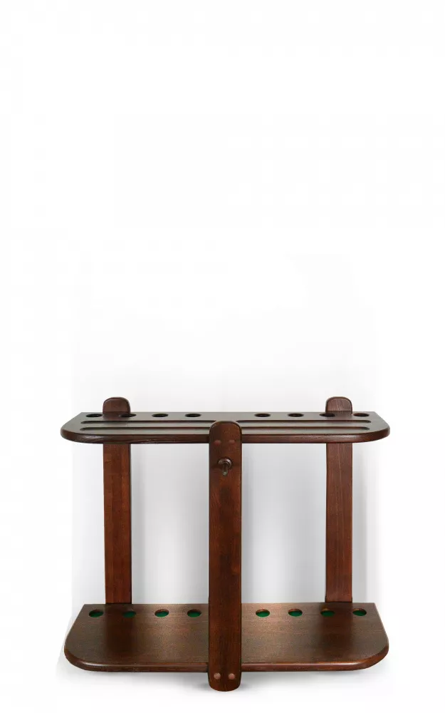 Модель напольная, предназначена для 8 киев, позволяет разместить треугольник, мелки, перчатки, а также бильярдные шары. Материал массив ясеня, дуб. Есть возможность выбрать цвет из палитры Фабрики «Старт»