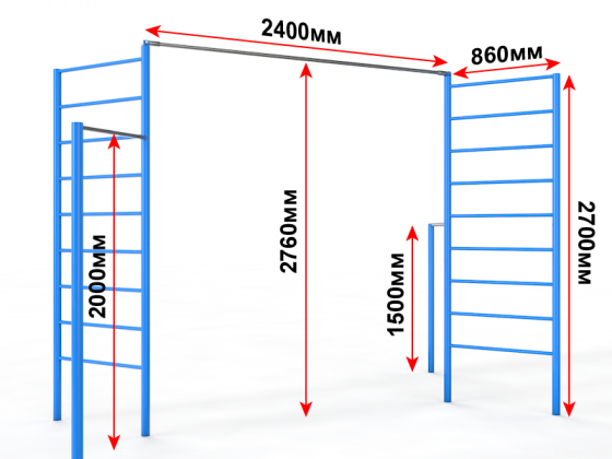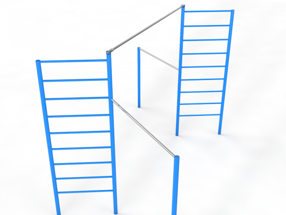Комплекс из турников (3шт) и шведских стенок (2шт), перекладины из нержавейки. Предназначен для установки на уличной площадке. Шарнирные узлы крепления высокого турника обеспечивают прогиб и упругую работу перекладины. Стойки изготовливаются из стальной трубы Д=76 мм. Перекладины из трубы Д=28 мм.