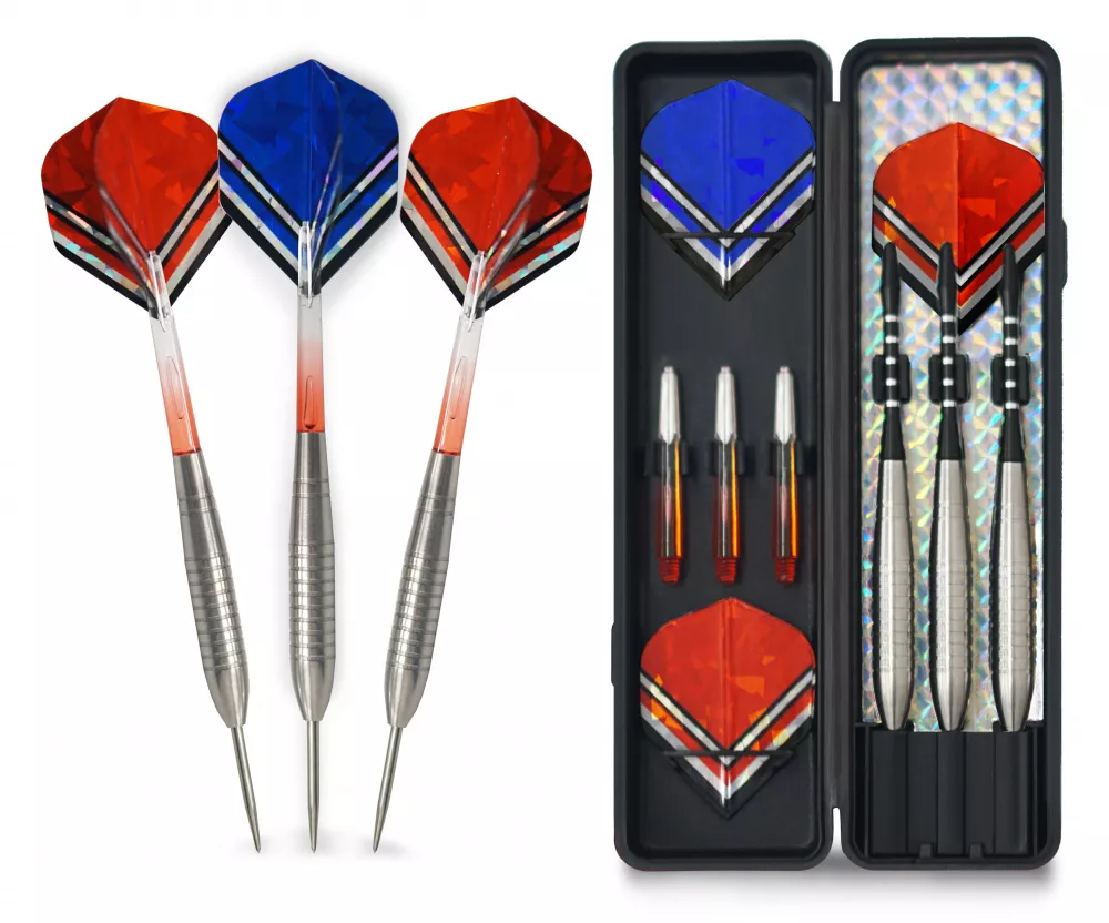 Комплект дротиков для игры в дартс среднего уровня, весом 23 гр. Дротики со стальными иглами для классических мишеней. В комплекте: футляр для хранения, 3 баррели, 3 алюминевых хвостовика, 3 пластиковых хвостовика, 6 оперений. Цвет хвостовиков и оперений в ассортименте.