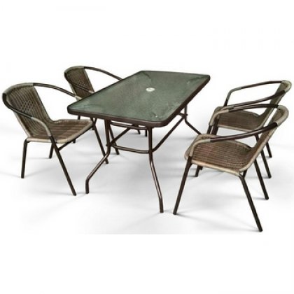 Стол: L120xW70xH70 см.Стекло: закаленное- 5 мм.Труба: сталь D25 с полимерным покрытием.Стол имеет отверствие для зонта.Столешница не имеет по периметру искусственный ротанг.Стул: W54хD58xH74 см.Каркас: труба сталь D25.Материал: искусственный ротанг. Объем и вес комплекта: 0,6м3, 30 кг