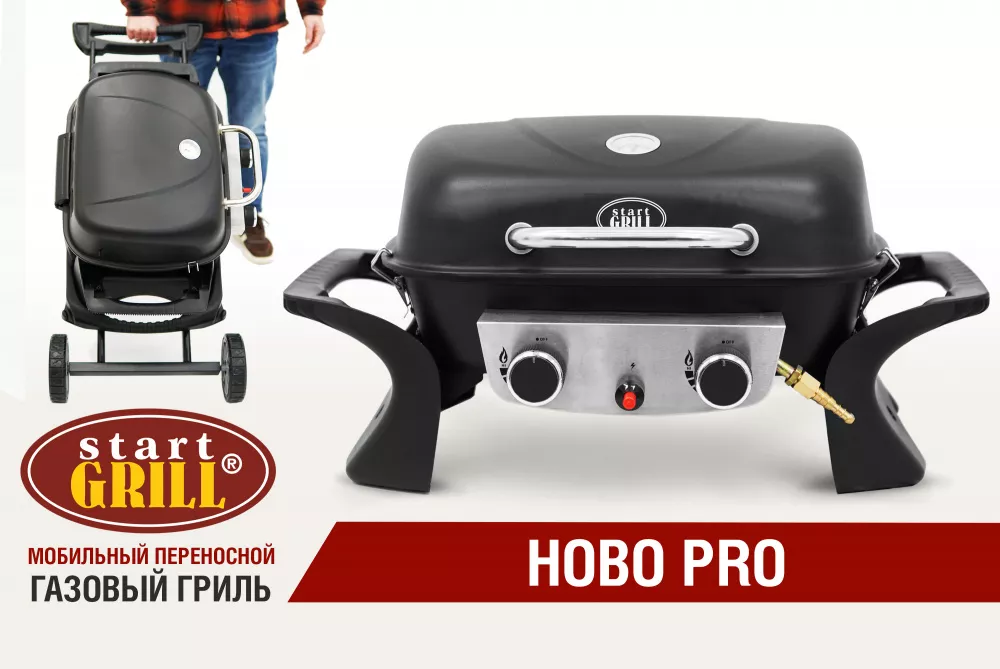 Преимущества HOBO PRO включают две горелки для более мощного и равномерного нагрева, встроенный термометр для контроля процесса готовки, а также пьезоподжиг для удобного разжигания. Гриль работает от стационарного газового баллона с российским соединением, и в комплекте поставляются шланг и регулятор.