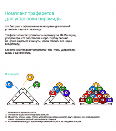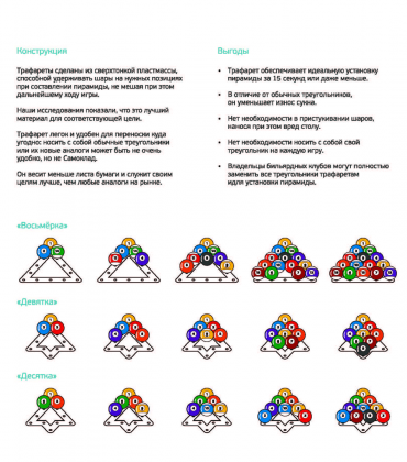 Трафареты сделаны из сверхтонкой пластмассы, способной удерживать шары на нужных позициях при составлении пирамиды, не мешая при этом дальнейшему ходу игры.