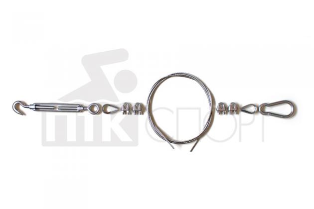 Комплект: 1 талреп нерж. 10 мм, 4 зажима, 2 коуша 8 мм, 1 карабин, трос d 4 мм
