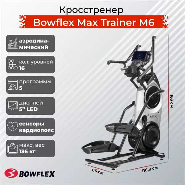 Созданный на базе самой популярной модели MaxTrainer® M5, новый тренажер Bowflex® MaxTrainer® M6 предлагает новый уровень тренировок с интеграцией интеллектуального мобильного приложения Bowflex JRNY ™. Данное мобильное приложение обеспечивает максимальную мотивацию, интеллектуальный контроль тренировки и вовлеченность в тренировочный процесс. Широкий программный функционал, удобная мотивирующая шкала-калориметр, показывающий расход калорий в конкретный момент времени и 16 уровней сопротивления позволяют тренироваться с максимальной эффективностью и быстро достигать поставленные фитнес цели.