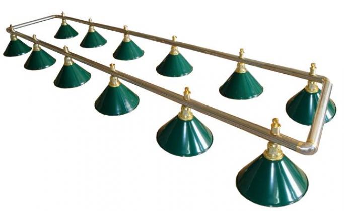 Изящная лампа классического дизайна органично впишется в любой интерьер. Устойчивые к механическим повреждениям металлические плафоны на металлической штанге обеспечивают не только качественное освещение игрового поля, но и создадут уютную атмосферу в бильярдном клубе или кабинете. Комплектуется цепочками и чашками для крепления к потолку. Предназначена для равномерного освещения игрового поля 12 футовых столов.