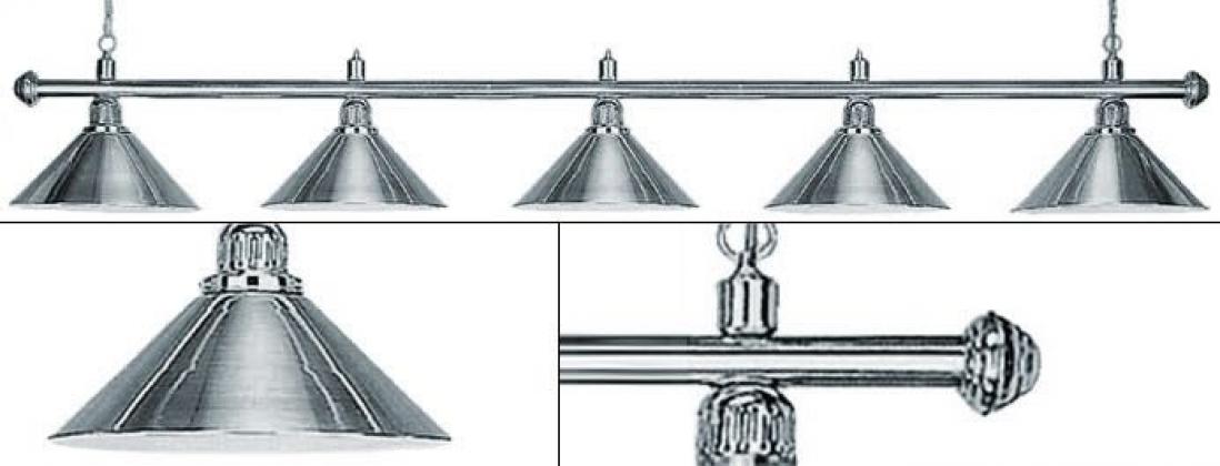 Изящная лампа классического дизайна органично впишется в любой интерьер. Устойчивые к механическим повреждениям металлические плафоны на металлической штанге обеспечивают не только качественное освещение игрового поля, но и создадут уютную атмосферу в бильярдном клубе или кабинете. Комплектуется цепочками и чашками для крепления к потолку. Предназначена для равномерного освещения игрового поля 10 - 12 футовых столов.