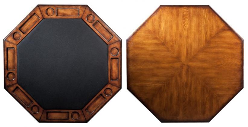 Игральная поверхность ломберного стола покрыта сукном. Столешница в комплекте позволяет использовать стол как обеденный и письменный. Также, защищает сукно от внешних повреждений, когда стол не используется как игральный.