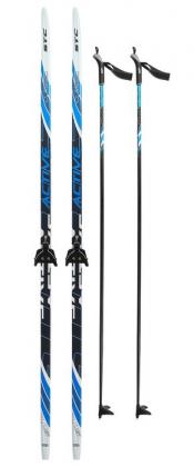 Лыжный комплект включает в себя лыжи с установленными на них креплениями. Конструкция лыж: внешняя оболочка из ABS пластика, облегченный клин из переклеенной древесины, шлифованная синтетическая скользящая поверхность. Скользящая поверхность с насечкой. Лыжи зарекомендовали себя хорошими ходовыми качествами. Крепления стандарт 75 мм. Крепления NN 75 представляют собой металлические крепления с дужкой. Ботинок удерживается на трех штырьках и прижимается дужкой за рант. Особенностью является разделение под правый и левый ботинок. Они недороги и просты в применении. Подходят к любому размеру ботинок этого стандарта.