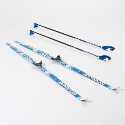 Лыжный комплект включает в себя лыжи с установленными на них креплениями. Конструкция лыж: внешняя оболочка из ABS пластика, облегченный клин из переклеенной древесины, шлифованная синтетическая скользящая поверхность. Скользящая поверхность с насечкой. Лыжи зарекомендовали себя хорошими ходовыми качествами. Крепления стандарт 75 мм. Крепления NN 75 представляют собой металлические крепления с дужкой. Ботинок удерживается на трех штырьках и прижимается дужкой за рант. Особенностью является разделение под правый и левый ботинок. Они недороги и просты в применении. Подходят к любому размеру ботинок этого стандарта.