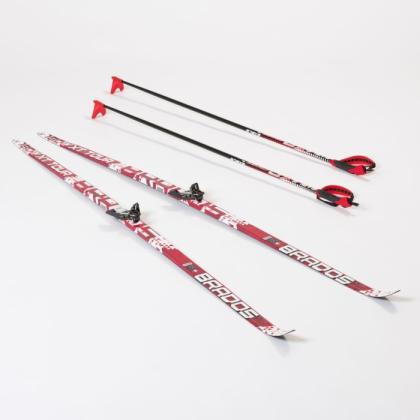 Лыжный комплект включает в себя лыжи с установленными на них креплениями. Конструкция лыж: внешняя оболочка из ABS пластика, облегченный клин из переклеенной древесины, шлифованная синтетическая скользящая поверхность. Скользящая поверхность без насечки. Лыжи зарекомендовали себя хорошими ходовыми качествами. Крепления стандарт 75 мм. Крепления NN 75 представляют собой металлические крепления с дужкой. Ботинок удерживается на трех штырьках и прижимается дужкой за рант. Особенностью является разделение под правый и левый ботинок. Они недороги и просты в применении. Подходят к любому размеру ботинок этого стандарта.
