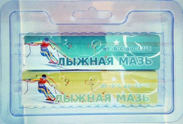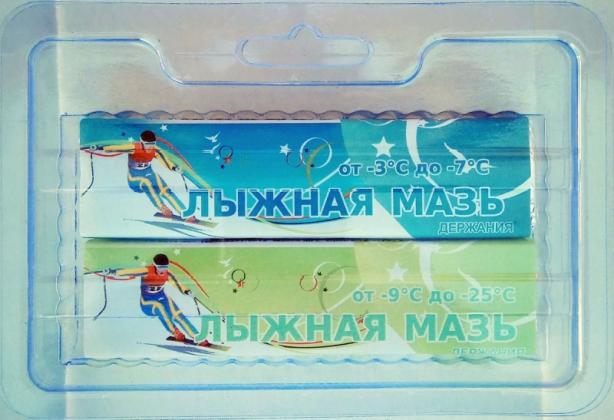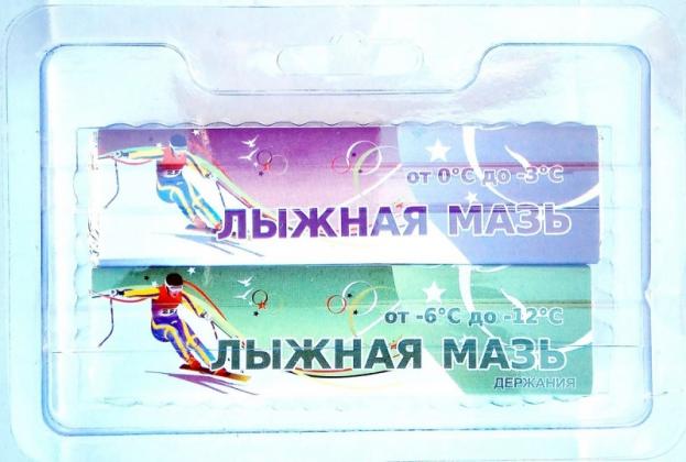 Комплект лыжных мазей из 2 брусков для разных эксплуатационных температур. Блистерная упаковка, ЕВРО-петля.