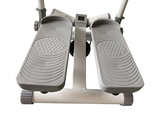 Поворотный мини-степпер c поручнями прорабатывает и тонизирует ягодицы и мышцы ног, снижая давление на кости и суставы. Система нагружения — 2 гидравлических цилиндра. Взаимозависимый ход педалей. Возможность изменения нагрузки и регулировка высоты педалей. Поручни для дополнительной устойчивости пользователя, регулируются по углу наклона. Нескользящая поверхность педалей (платформ) для ног. Компьютер: время, количество шагов за тренировку, ритм (количество шагов в минуту), калории, скан. Питание компьютера от батарейки.