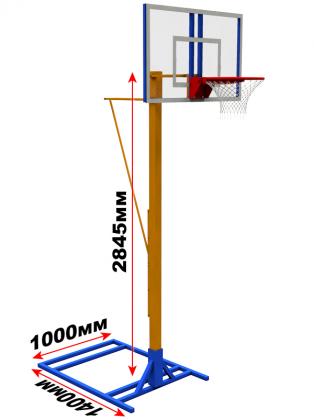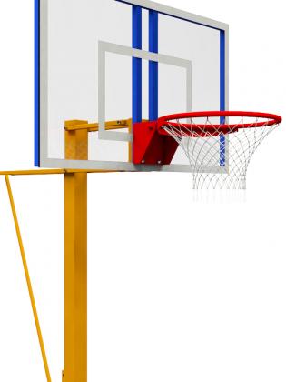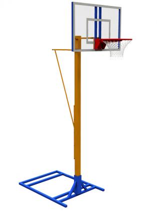 Устойчивая, прочная сварная конструкция, состоящая из вертикальной стойки выполненной из профильной трубы 80х80х2 мм, консоли с закрепленным на ней щитом, наклонной стойки консоли и опорной конструкции в основании стойки. Стойка обязательно должна быть зафиксирована с помощью дополнительного груза. Груз устанавливается на заднюю площадку основания. Масса груза не менее 180 кг. Груз может представлять из себя любой удобный для пользователя материал, например, мешки с цементом. Запрещается висеть на баскетбольном кольце.