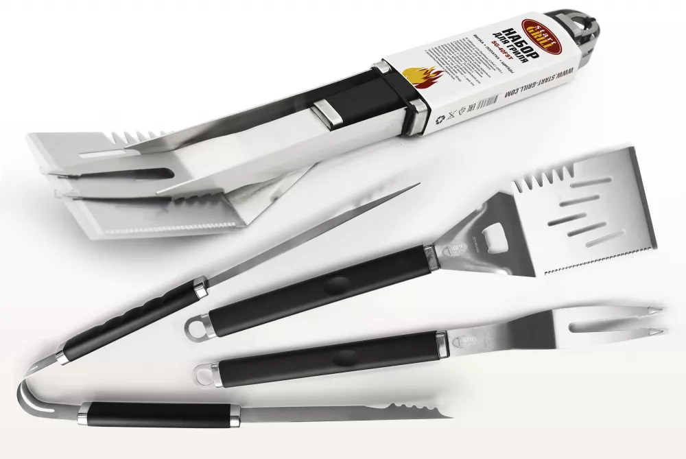 Практичный набор инструментов состоит из 3 предметов: вилка, щипцы и лопатка. Предназначен для удобного переворачивания продуктов. Небольшого размера, из нержавеющей стали, с ручками из термопластичной резины,что позволит не получить ожёгов во время приготовления еды.