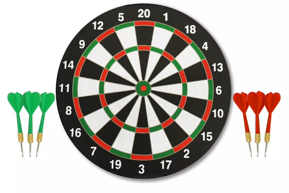Набор для игры в дартс начального уровня. Мишень из прессованной бумаги повышенной прочности с двусторонним нанесением - печатные цифры. Диаметр мишени 37 см. Набор упакован в блистер, в комплект входят 6 дротиков весом 6 гр.
