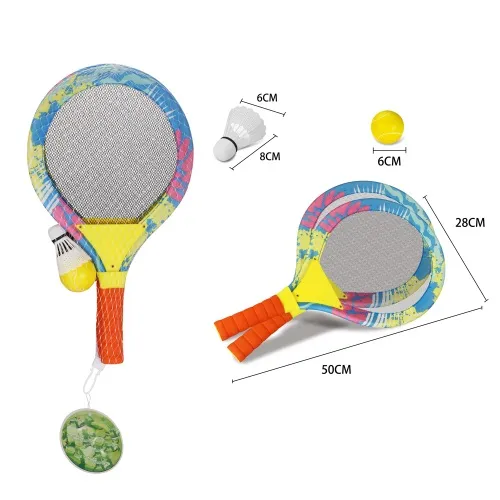 С помощью этого набора Вы поможете Вашим детям приобрести первоначальные навыки игры в большой теннис и просто весело провести время. Ракетки изготовлены из пластика, что избавит Вас от необходимости перетягивать износившиеся струны и снабжены оплеткой для лучшего хвата. Этот комплект Вы можете взять с собой в парк, на пляж, или использовать во время загородного отдыха.