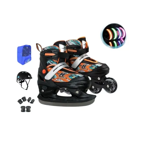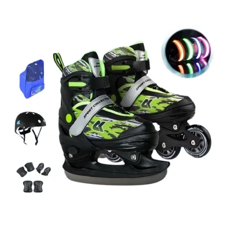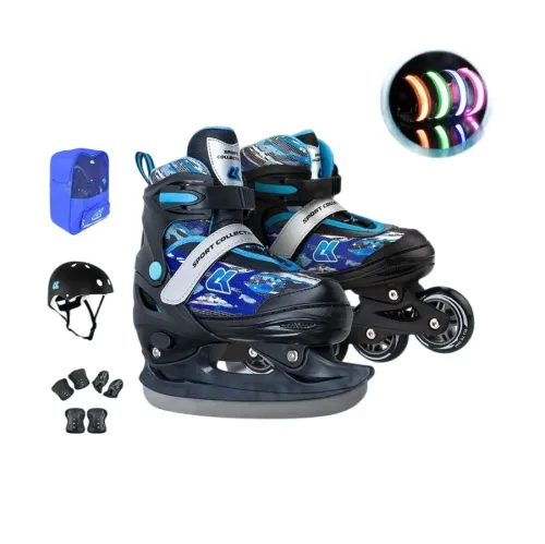 Комплект ледовых коньков-трансформеров с подсветкой и роликовой защиты-идеальный вариант для тех, кто хочет приобрести разом весь инвентарь для катания зимой и летом. Все необходимые аксессуары в одной сумке.