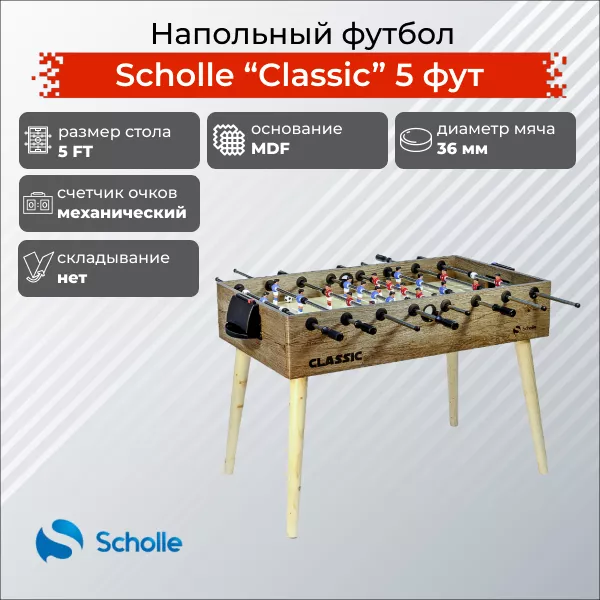 Настольный футбол SCHOLLE “CLASSIC” идеально подойдет для игры дома или в офисе, а благодаря своему изысканному дизайну удачно впишется в любой интерьер. Корпус, борты стола и игровое поле выполнены из МДФ, штанги - из хромированной стали, ножки - из пород твердого дерева. Фигурки игроков сделаны из высокопрочного пластика устойчивого к механическим повреждениям. Угол вращения вратаря - 360 градусов. На поле 22 фигурки игроков. Размер стола - 5 FT, длина - 134см. Данная модель предназначена для продвинутых игроков. Стол оснащен механическим счетчиком голов. В комплекте: инструкция по сборке, мячи (2 шт).