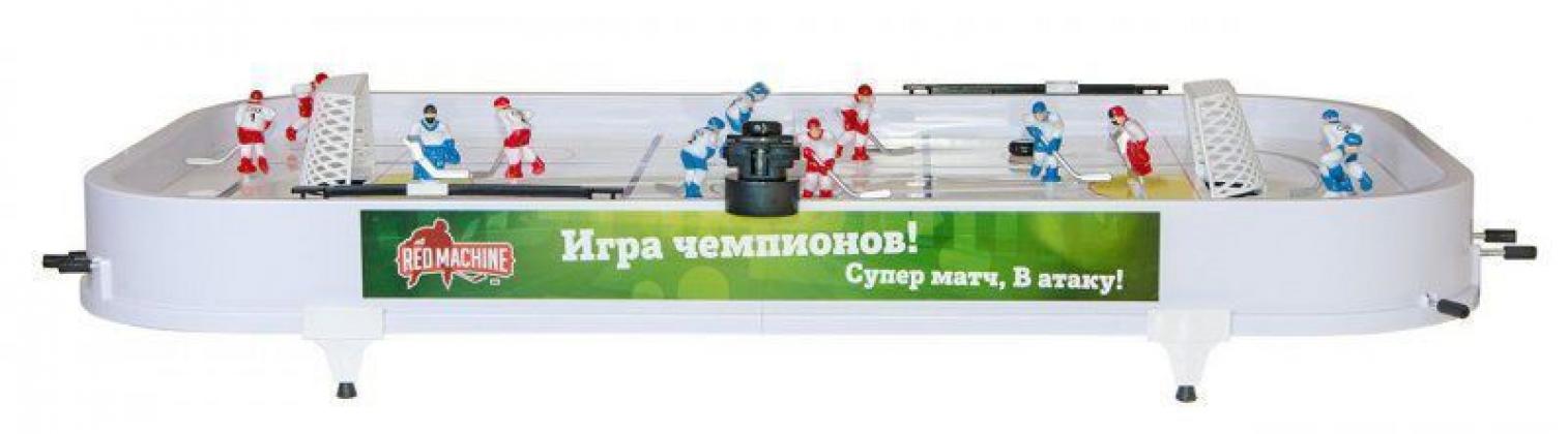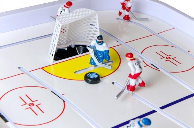 В комплект входит: Команда синих игроков - 5 шт + вратарь Команда красных игроков - 5 шт + вратарь Ворота - 2 шт Механические счеты - 2 шт Шайбы - 2 шт Система выброса шайбы - 1 шт.