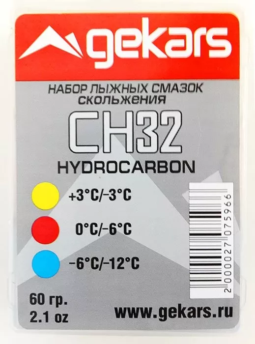 СH33 0...-6*С красная отлично работает в своем температурном диапазоне для слабого мороза, средней влажности,мелкозернистого и свежего снега. При высокой влажности (более 80%) воздуха можно применять универсальную смазку синего цвета подходит для низкой или средней влажности воздуха и снега любой структурыю от -6 до - 12*С. СH33 -10...-20*С зеленая смазка для скольжения для сухого порошкообразного или мелкозернистого снега.СН32 +3-3*С желтая применяется для влажного снега любой структуры, в начале или в конце оттепели при слабом морозе. СH32 0...-6*С красная отлично работает в своем температурном диапазоне для слабого мороза, средней влажности,мелкозернистого и свежего снега. При высокой влажности (более 80%) воздуха можно применять универсальную смазку синего цвета подходит для низкой или средней влажности воздуха и снега любой структурыю от -6 до - 12*С.