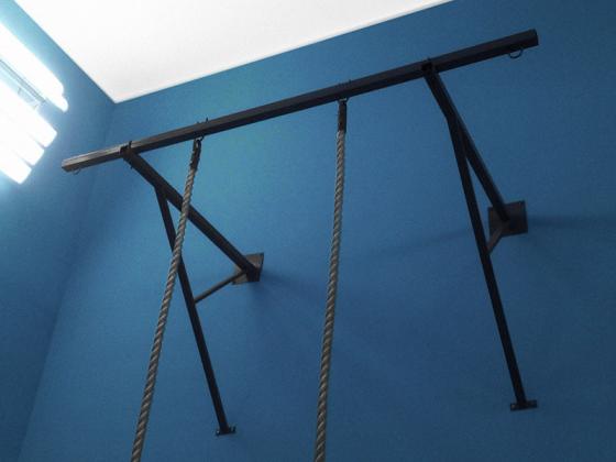 Подвеска для канатов и шестов на 4 элемента. Металлическая конструкция из 2-х угловых кронштейнов, изготовленных из профильной трубы 60х60 мм и перекладины 80х80 мм с креплениями для канатов и шестов.