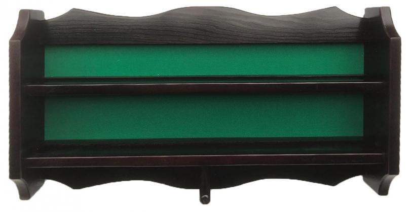 Две горизонтальные поверхности полки снабжены продольной нишей для лучшей фиксации шаров. Задняя панель обтянута сукном классического зеленого цвета.