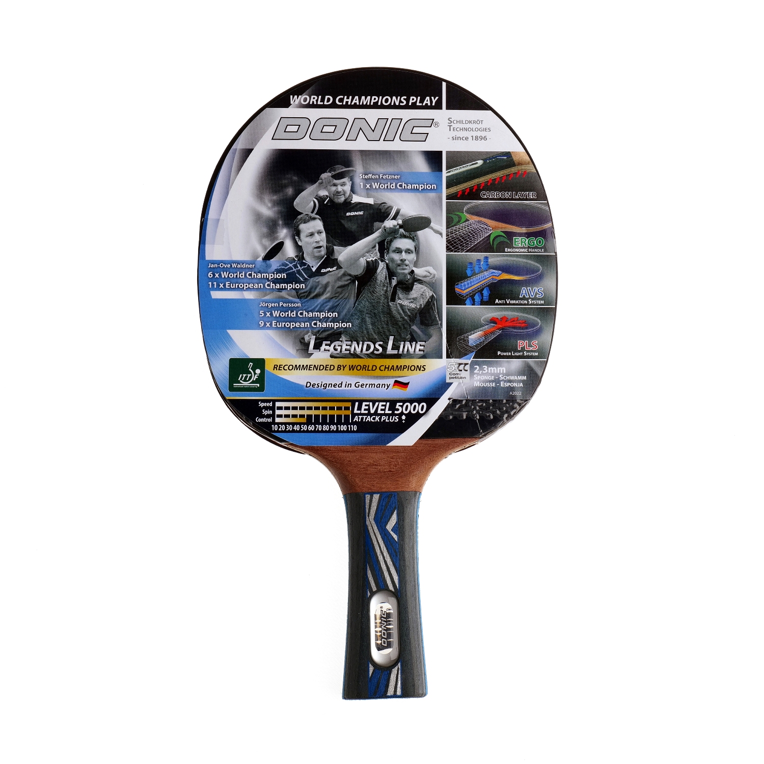 Ракетка DONIC "LEGENDS 5000" — это профессиональный инструмент для игры в стиле Атака+, одобренный Международной федерацией настольного тенниса (ITTF). Она оснащена накладкой Liga, созданной по технологии SR, которая обеспечивает высокий контроль и долговечность. Толщина губки 2,3 мм идеально сбалансирована для мощных атакующих ударов и быстрого реагирования. Конструкция рукоятки включает системы AVS, PLS и ERGO, что повышает точность, снижает вибрации, уменьшает вес и обеспечивает комфортный захват. В основе рукоятки — карбоновый слой, который делает ракетку жестче, повышает скорость и точность ударов. Ручка из эргономичной формы точно прилегает к руке, предотвращая усталость. Размер ракетки — 25,8 х 14,5 х 1,4 см, вес — 0,21 кг, в упаковке — 0,23 кг. Модель идеально подходит для атакующих игроков, которым важна мощь, контроль и высокая скорость.