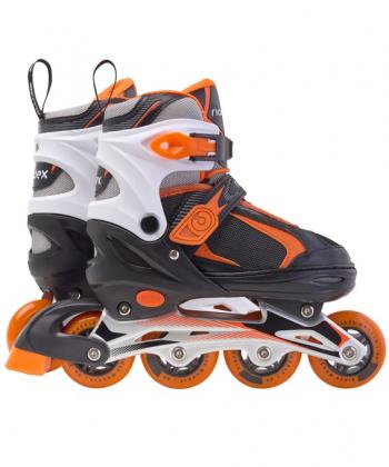 Внешний ботинок создан из противоударного пластика, который позволяет не только защитить ногу от травм, но и способствует отличной фиксации. Благодаря классической шнуровке, пластиковой клипсе и ремешку на липучке стопа идеально зафиксирована и увеличивает маневренность роликовых коньков. Подшипники ABEC-7 придают отличный разгон, а полиуретановые колеса поддерживают необходимую скорость. Алюминиевая подвеска обеспечивает безопасность и долговечность роликов, а регулируемость в пределах 4-х размеров позволяет идеально подобрать модель «по ноге».