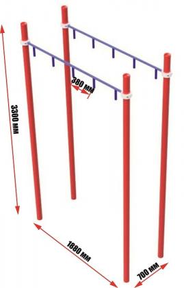 Характеристики: Стойки из стальной трубы-наружный диаметр D=89 мм, толщина стенки 3,5 мм.Диаметр перекладин: 34 мм - наружный диаметр.Шаг рукояток: 380 мм.Высота стоек над уровнем земли 2600 ммОбщая высота стоек с бетонируемой частью 3500 мм
