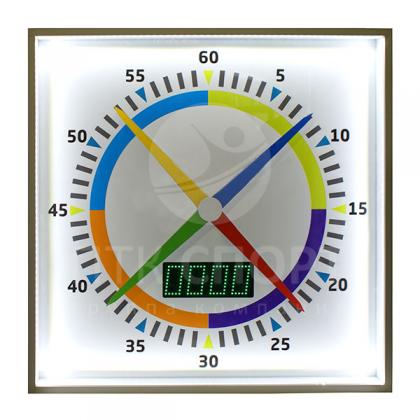4-х стрелочный cекундомер с логотипом "ПТК "Спорт"Габаритные размеры - 900х900 мм, профиль 130 мм (пластик)С подсветкойВстроенные электронные часыДистанционное управление часами