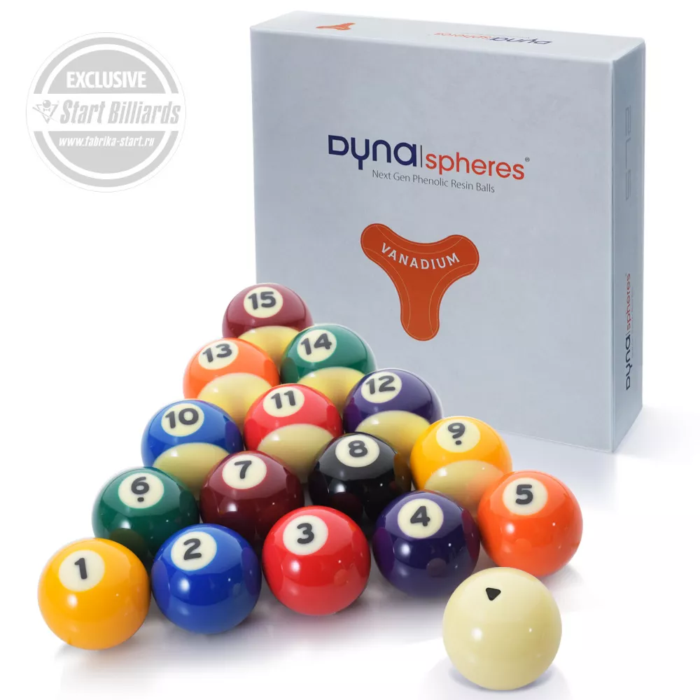 ШАРЫ DYNASPHERES VANADIUM POOL NEXT GEN 57,2 ММ - высококачественные шары нового поколения из фенол-альдегидной смолы бельгийского бренда Dyna | spheres TM, зарекомендовавшим себя в мире среди профессиональных игроков. Комплект для пула состоит из 15 шаров с номерами и битка. Диаметр шаров в комлекте составляет стандартные 57,2 мм. Качество DYNASPHERES VANADIUM POOL NEXT GEN отвечает самым высоким требованиям как спортсменов-любителей, так профессиональных игроков.