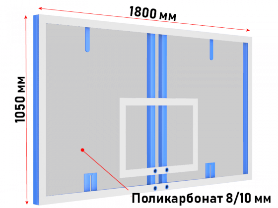 Щит баскетбольный профессиональный предназначен для крепления к баскетбольной ферме или стойке и имеет размер 1800х1050 мм (ШхВ).Может быть изготовлен из поликарбоната толщиной 8, либо 10 мм (на выбор). Поликарбонат прикреплен к металлической раме (профиль рамы 40х40 мм).Крепление под кольцо по центрам отверстий: 100х110 мм (ШхВ).Цвет разметки БЕЛЫЙ (на заказ красный, черный).Вес от 32 до 38,7 кг, в зависимости от толщины поликарбоната.К баскетбольному щиту рекомендуется приобрести ферму или стойку, а также баскетбольное кольцо и сетку.