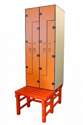 Размер шкафа: (ширина/глубина/высота) 824х500х1500ммРазмер скамьи: (ширина/глубина/высота) 824х860х450ммНаполнение каждой секции: верхняя или нижняя полка, штанга, крючок, механический замокЦвет: любой из палитрыМатериал: пластик HPL толщиной 8 мм