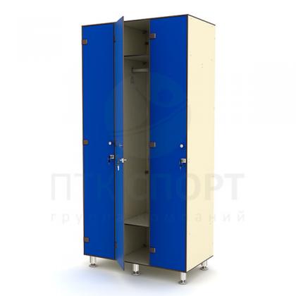Размер: (ширина/глубина/высота) 932х500х1950 ммНаполнение каждой секции: верхняя полка, нижняя полка, штанга, крючок, механический замокЦвет: любой из палитрыМатериал: пластик HPL толщиной 8 мм