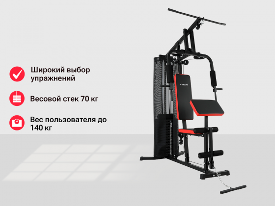 Силовой комплекс UNIX Fit Block 70 - это спортивный зал у вас дома, который позволит выполнять силовые упражнения:- Жим от груди;- Жим от плеч;- Баттерфляй;- Верхняя тяга;- Нижняя тяга;- Отведение ног;- Приведение ног;- Пресс-спина;- Разгибание ног;- Сгибание на бицепс.Отягощение осуществляется грузовыми блоками общим весом 70 кг. Максимальный вес пользователя составляет 140 кг.С силовым комплексом UNIX Fit BLOCK 70 вы проработаете основные группы мышц:- Мышцы спины;- Мышцы кора;- Мышцы грудного отдела;- Мышцы плечевого пояса и рук;- Мышцы передней поверхности бедра;- Мышцы передней поверхности голени;- Ягодичные мышцы.Тренировка будет приятной, так как тренажер обладает следующим набором характеристик:- Удобной мягкой спинкой и сидением;- Обрезиненными ручками - защитят ваши ладони от скольжений;- Неопреновые мягкие валики повысят удобство выполнения упражнений;- Надежность креплений.- Тросы выполнены из высококачественной стали в ПВХ-оболочке, все соединения с усилением сварного шва.- Ограничители движения троса обеспечат безопасность воздействия троса на руки;- Двухслойная порошковая покраска рамы позволяет сохранить внешний вид тренажера и обезопасить его от внешнего воздействия (сколов и царапин);- Долгую службу и прекрасный внешний вид обеспечит обивка, устойчивая к истиранию, выполненная из ЭКО-кожи под карбон.