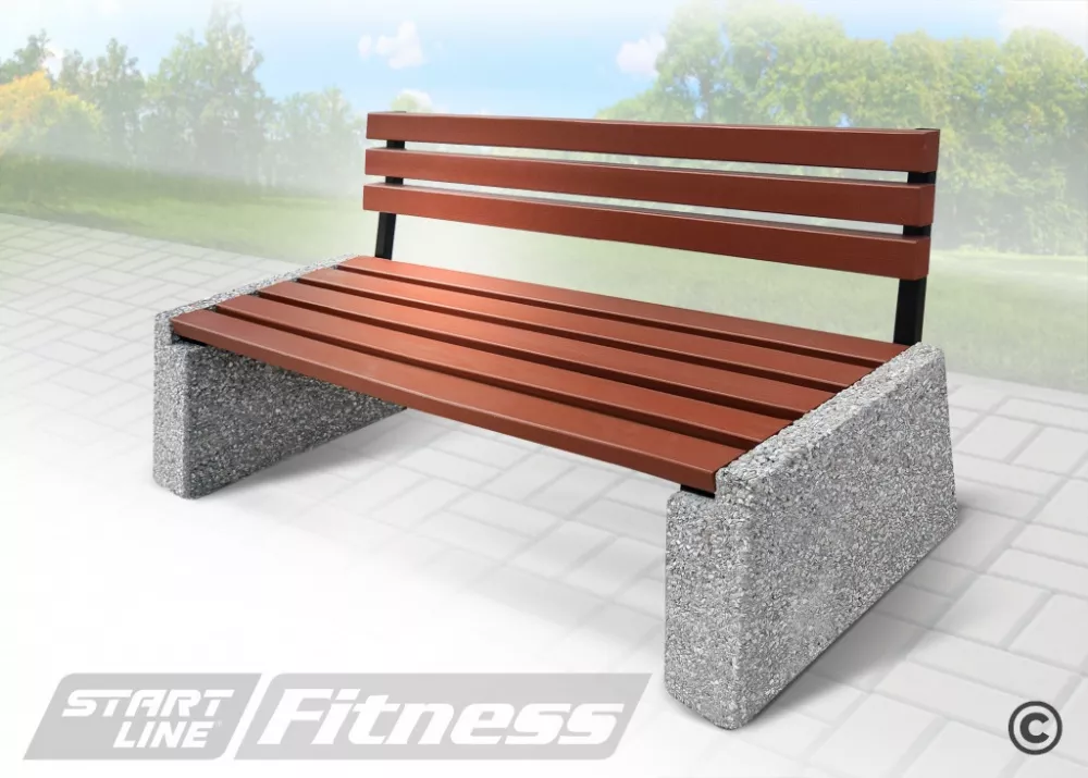 Решетки сиденья и спинки визуально облегчают конструкцию опор, создавая привлекательный внешний вид. Фактура камня и гладкая поверхность деревянных реек гармонично смотрятся на природном ландшафте.