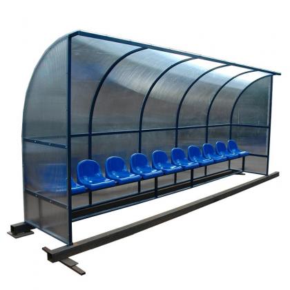 Скамья для запасных игроков / тренеров / судей / командного персоналана 10 местЦельносварной металлокаркас, поликарбонат, кресло пластиковое со спинкой. По желанию заказчика возможна замена индивидуальных пластиковых сидений на сплошные деревянные скамьи со спинками, что бывает удобно при ненормированном количестве посадочных мест.
