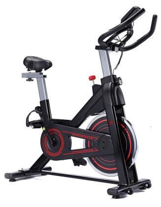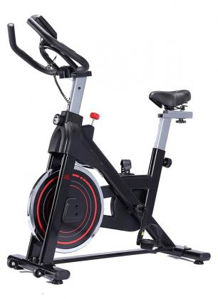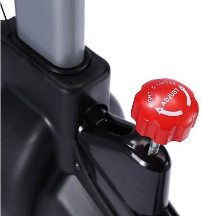 Вертикальный механический спин-байк с ременным типом привода и колодочной системой нагружения. Изменение нагрузки с помощью удобной рукоятки на корпусе тренажера. Анатомическое сидение регулируется в вертикальной и горизонтальной плоскости, и позволяют подобрать удобную посадку для тренировки. Для контроля пульса во время тренировки на руле есть встроенные датчики с отображением информации на дисплее компьютера. Питание компьютера от батареек (тип ААА, 2 шт). Для перемещения тренажера в помещении установлены колеса. Фиксация ног в педалях с помощью резиновых ремней с регулировкой.
