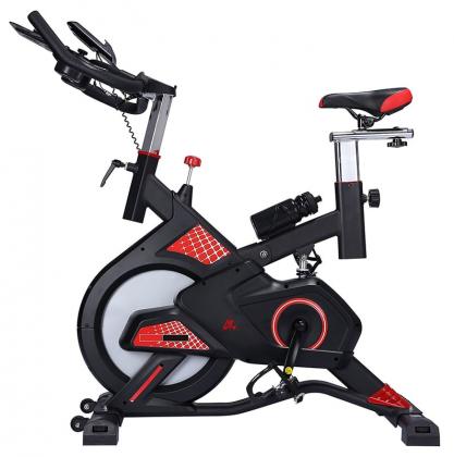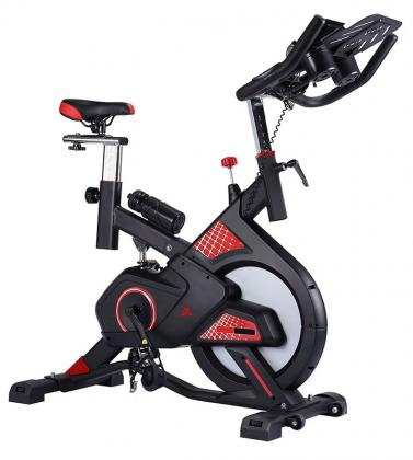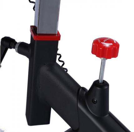 Вертикальный механический спин-байк с ременным типом привода и колодочной системой нагружения. Изменение нагрузки с помощью удобной рукоятки на корпусе тренажера, с экстренным тормозом. Спортивное сидение регулируется в вертикальной и горизонтальной плоскости, и позволяют подобрать удобную посадку для тренировки. В комплекте пластиковая бутылка для воды с держателем на раме тренажера. Для контроля пульса во время тренировки на руле есть встроенные датчики с отображением информации на дисплее компьютера. Питание компьютера от батареек (тип ААА, 2 шт). Держатель для планшета и два подстаканника по краям позволят провести тренировку с комфортом - насладится любимым треком или фильмом, охладится во время интенсивной гонки. Для перемещения тренажера в помещении установлены колеса. Фиксация ног в педалях с помощью резиновых ремней с регулировкой.