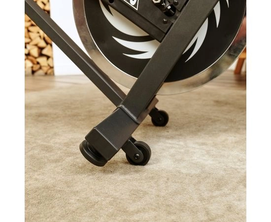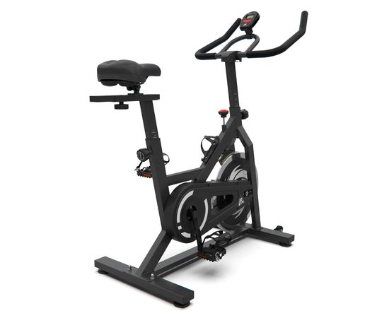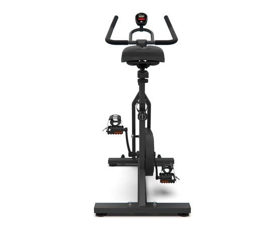 Спин-байк имеет трехкомпонентный педальный узел и размер в рабочем виде составляет 113 х 49,5 х 120 см. Монохромный LCD дисплей позволяет легко читать данные на консоли, а транспортировочные ролики и компенсаторы неровности пола обеспечивают удобство в использовании и хранении.
