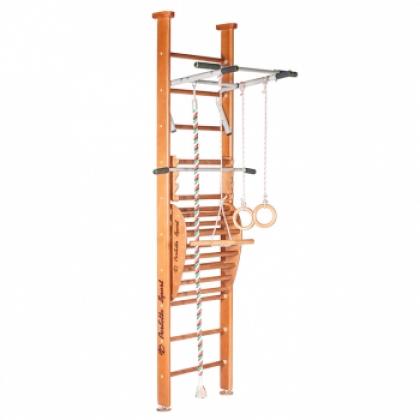 Комплектация: шведская стенка разборная, турник стационарный с неопреновыми ручками , кольца гимнастические деревянные, тарзанка, канат, тренажер Vinsere