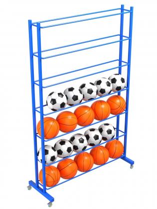 Стеллаж-стойка для хранения и перемещения мячей. Изготовлен из профильных труб 25х25х1,5 мм, легко перемещается, т.к. имеет ролики с фиксаторами.