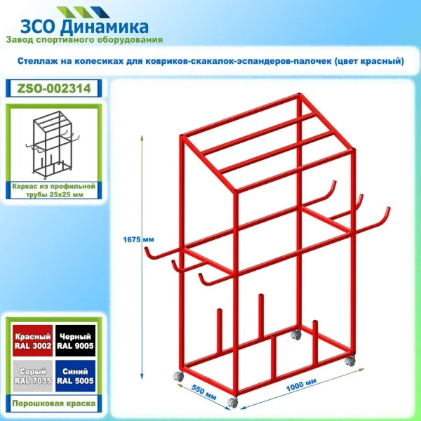 Стеллаж на колесиках для ковриков-скакалок-эспандеров-палочек (цвет красный)