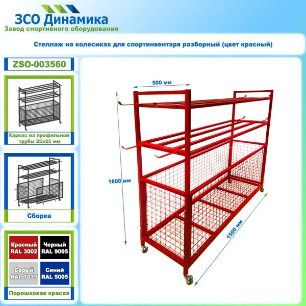 Стеллаж на колесиках для спортинвентаря разборный (цвет красный)