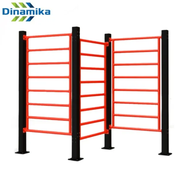 Стенка змейка для воркаута представляет собой сборно-разборную конструкцию, состоящую из стоек и решеток с перекладинами из стальной трубы. Сварные швы данного изделия тщательно обработаны и зачищены. Поверхность изделия окрашена порошковым напылением в электростатическом поле. В комплекте со стенкой имеются все детали для сборки (комплект под бетонирование). Изделие может быть исполнено под установку в зале или на покрытии без использования бетонирования.