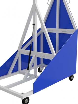 Мобильная складная стойка снабжена поворотными и не поворотными колесами, и в сложенном состоянии перекатывается одним человеком.