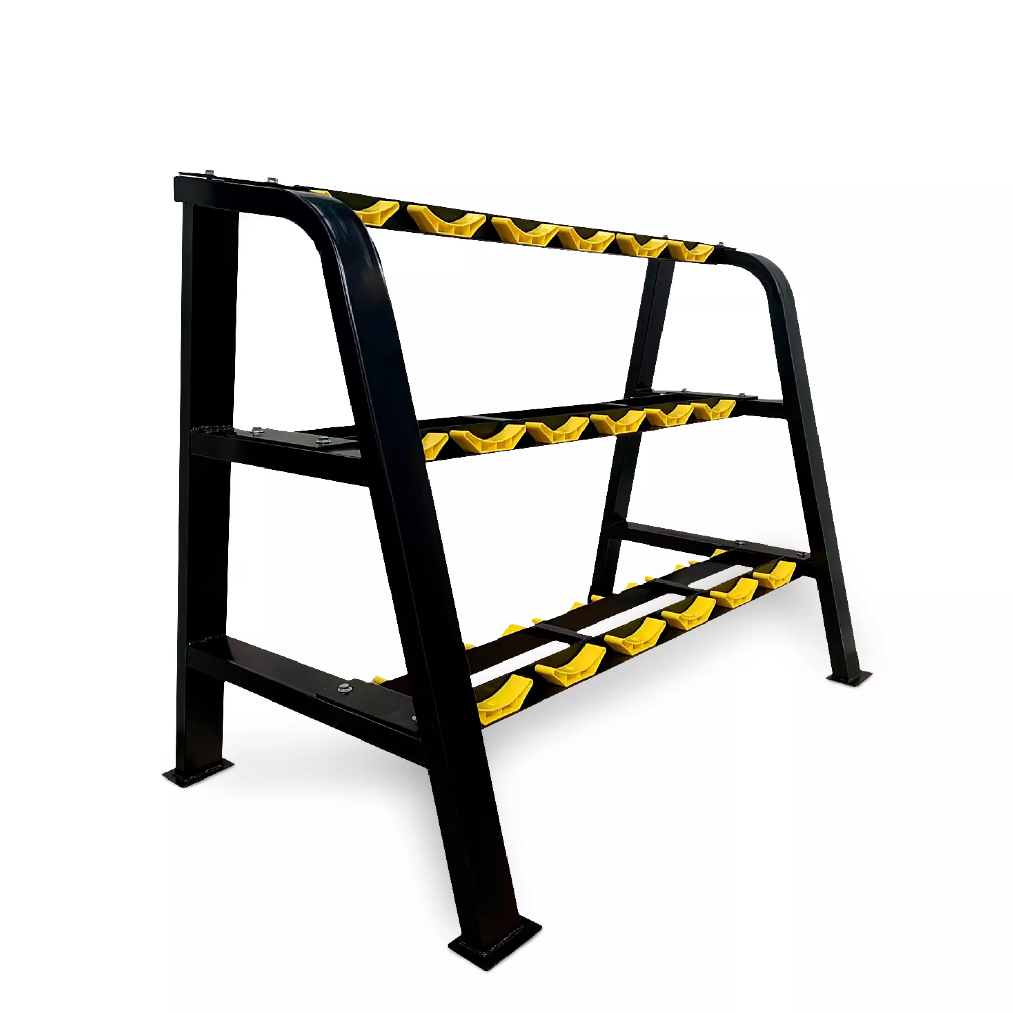 Подставка для гантелей изготовлена из особопрочной стали Q235, которая используется для производства деталей с большим уровнем нагрузки, например для строительства мостов и зданий. Такая конструкция с толщиной стали 1,8 мм обеспечивает надежное и безопасное хранение гантелей различного веса, защищая их от повреждений, сохраняя порядок в тренировочном пространстве. Трехрядная конструкция с противоскользящими ножками обеспечивает удобный доступ к гантелям во время тренировок.