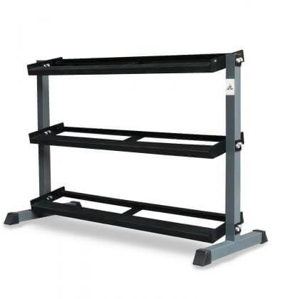 Стойка для хранения профессиональных гантелей DFC из серии POWERGYM RA070 чёрного цвета с серым корпусом для домашнего использования. Стойка с тремя полками, максимальная нагрузка на каждую - до 100 кг. Полки для хранения с нескользящим покрытием.