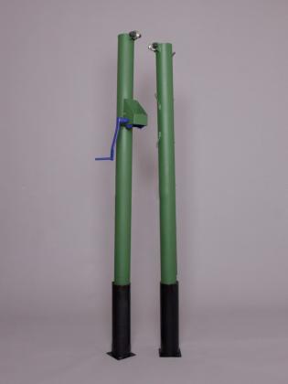 Встроенный механизм натяжения сетки - внешний храповик. Стойки изготовлены из стальной трубы диаметром 76 мм., диаметр стаканов 82 мм. Высота теннисной стойки от пола 1140 мм. В комплекте крышки и стаканы под бетонирование, высота стаканов 350 мм. При необходимости теннисные стойки могут быть легко демонтированы из стаканов, а отверстия в стаканах закрываются крышками.