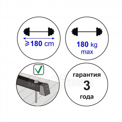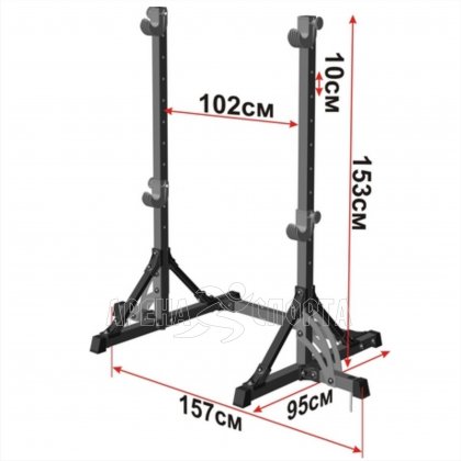 - растояние между стойками: 102 см- штанга: не более 180 см- крепление к полу: анкеры ( в комплекте)